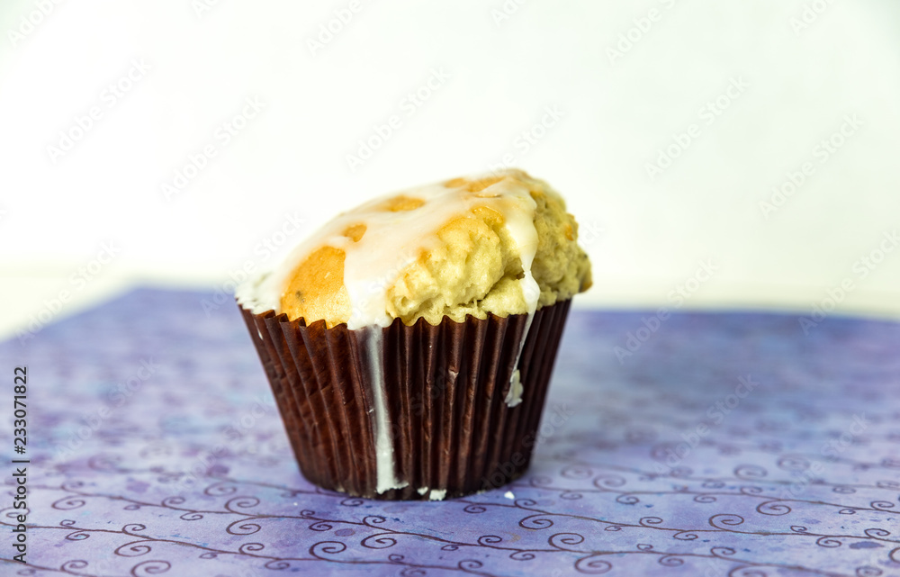 Lemon Lavender Pound Cake Muffin Brown Paper Wrapper On Purple Base And White Background Coffee Cake Pastry From Bakery With White Icing Drizzled Over Top Stock Photo Adobe Stock